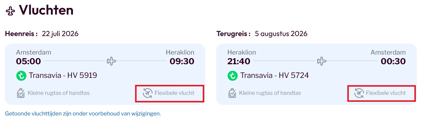 Het verschil tussen flexibele en niet-flexibele vluchten is de manier waarop deze ingekocht worden. Hierdoor gelden er afwijkende voorwaarden. In de boekingsstappen kun je zien of de vlucht een flexibele of niet-flexibele vlucht is.